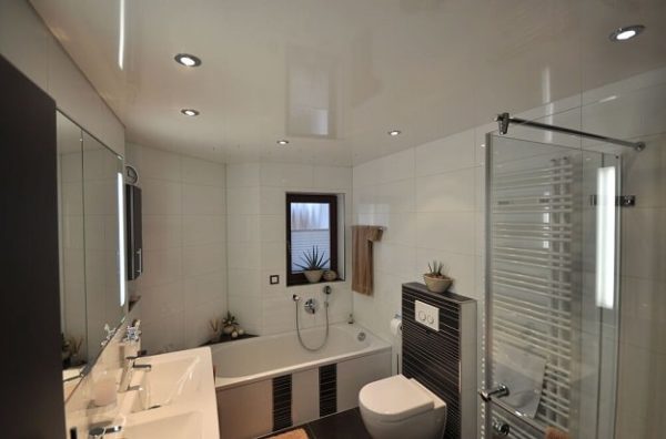 В этом самом приватном месте стоит наиболее внимательно отнестись к качеству материалов: полотна для потолков должны быть сертифицированы надежным производителем, гарантирующим отсутствие токсичных веществ. Дизайн также может быть разнообразным, однако лучше избегать слишком ярких и пестрых расцветок. А вот некоторых насыщенных тонов можно не бояться: например, глубокий синий или фиолет будет создавать особый релакс.