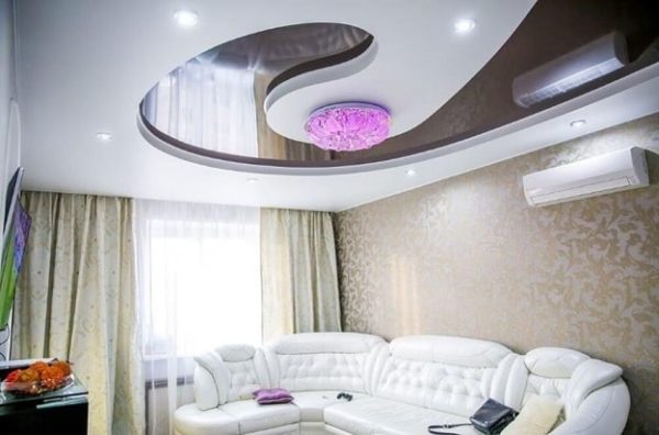 В этом традиционном месте для отдыха и общения с гостями можно монтировать любые натяжные потолки – какие нравятся. Единственное, что стоит учесть заранее: если понравилась зеркальная или глянцевая пленка, подумайте, устроят ли вас блики, которые неизбежно появятся от включенного телевизора, монитора ПК или других устройств.