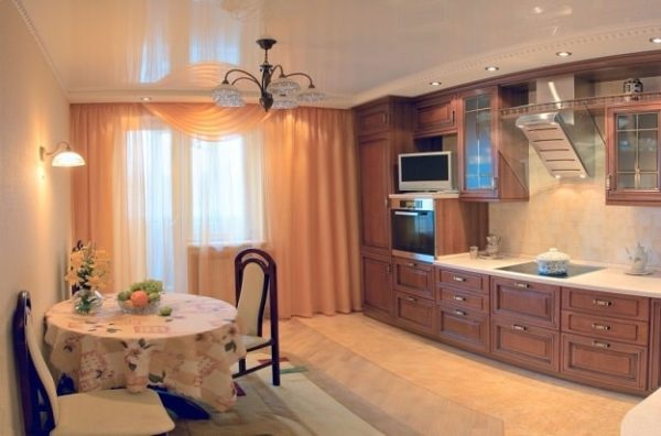 В зоне приготовления пищи наблюдаются повышенная влажность, перепады температур и высокий риск загрязнений. Поэтому здесь точно не стоит натягивать тканевые потолки – только хорошо моющиеся пленочные. Хорошим дизайнерским решением могут стать комбинированные или разноуровневые конструкции, которое позволят зонировать кухню, особенно если она совмещена со гостиной.
